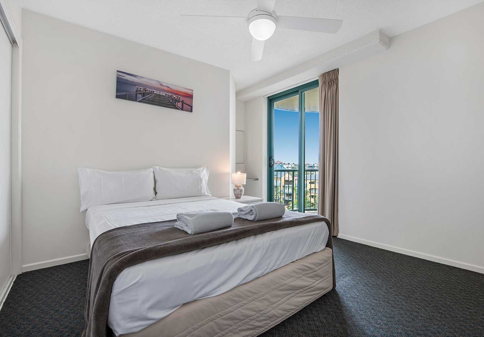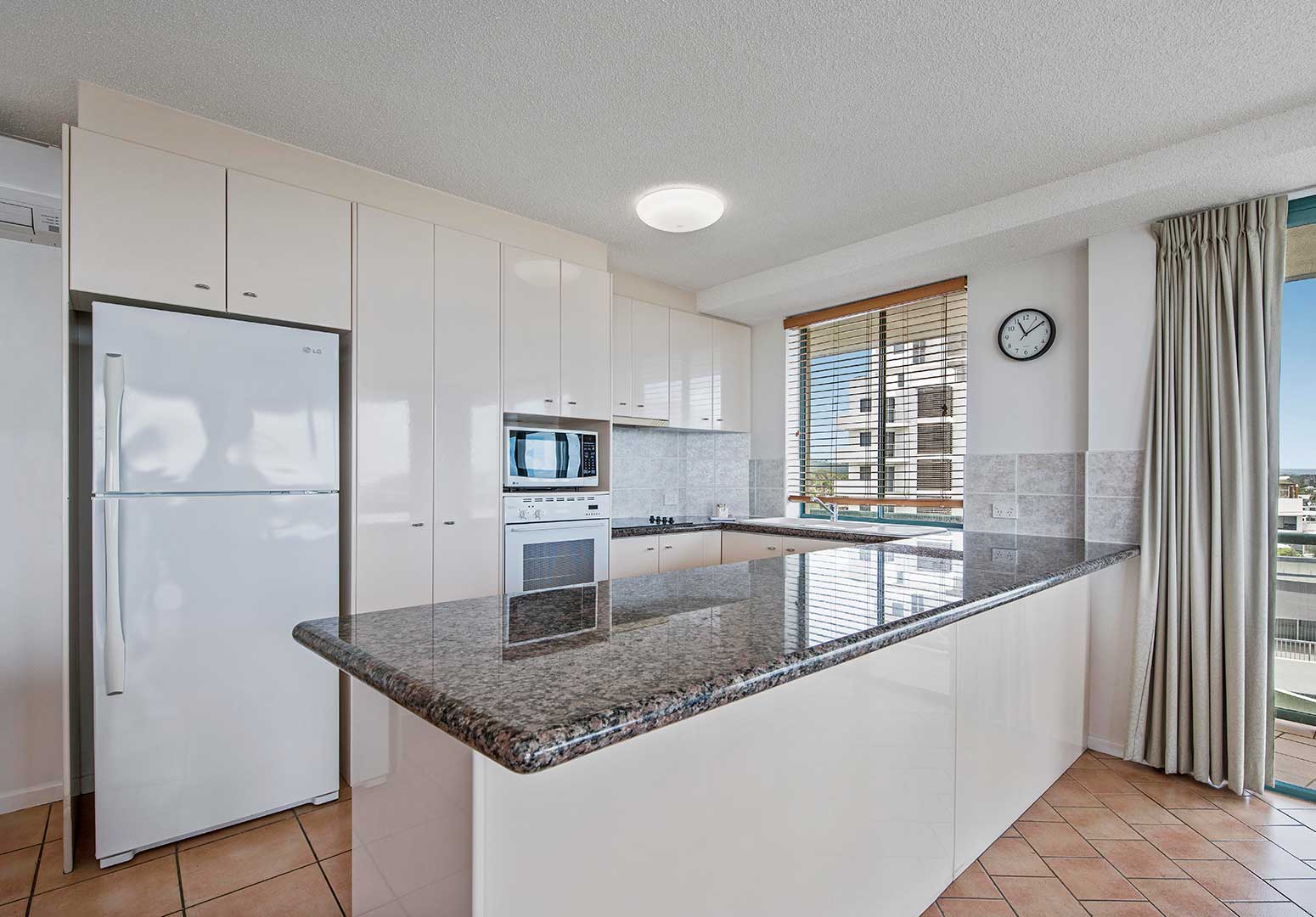 Three-bedroom holiday apartments accommodate up to six guests and feature a spacious beachfront balcony with ocean views, as well as a rear balcony overlooking the pool.