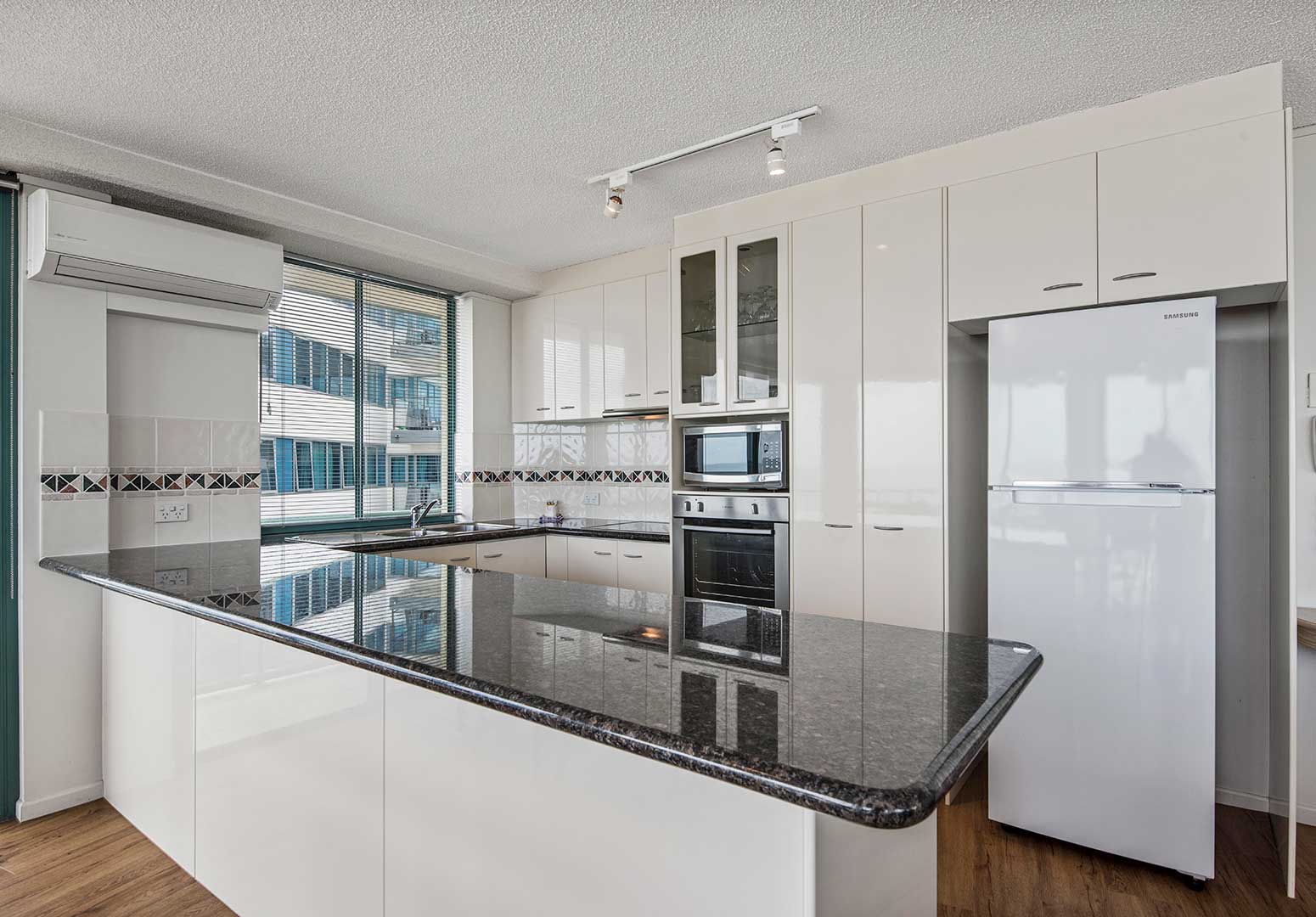 Accommodating up to six guests, these apartments share the same spacious layout as other three-bedroom options, featuring floor-to-ceiling glass sliding doors that open onto a private beachfront balcony. Inside, a large open-plan living area and fully self-contained kitchen provide all the comforts of home. The master bedroom includes a queen bed and ensuite, the second bedroom also has a queen bed, and the third bedroom is furnished with two single beds. A main bathroom with shower/bath and a separate toilet complete the space.