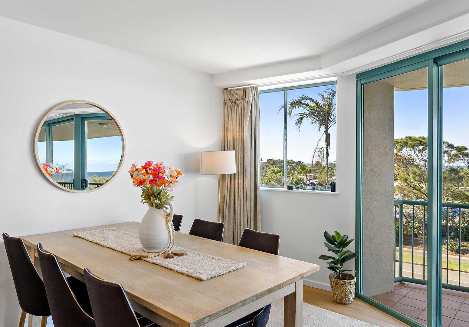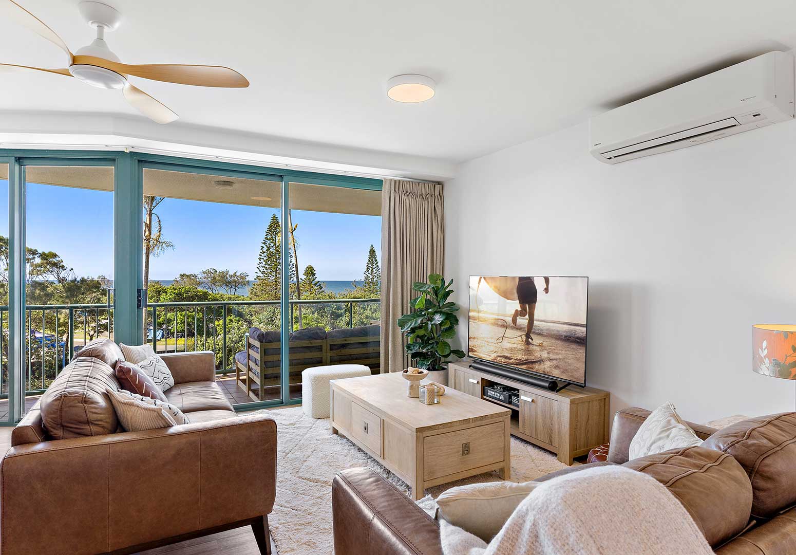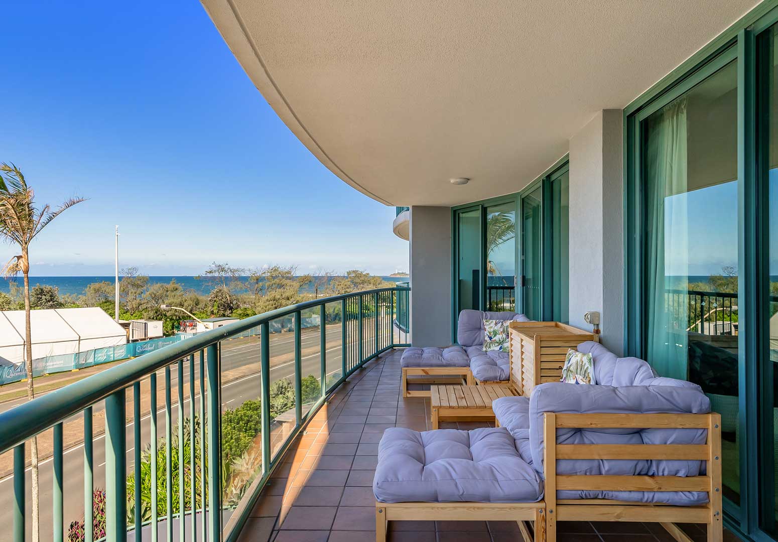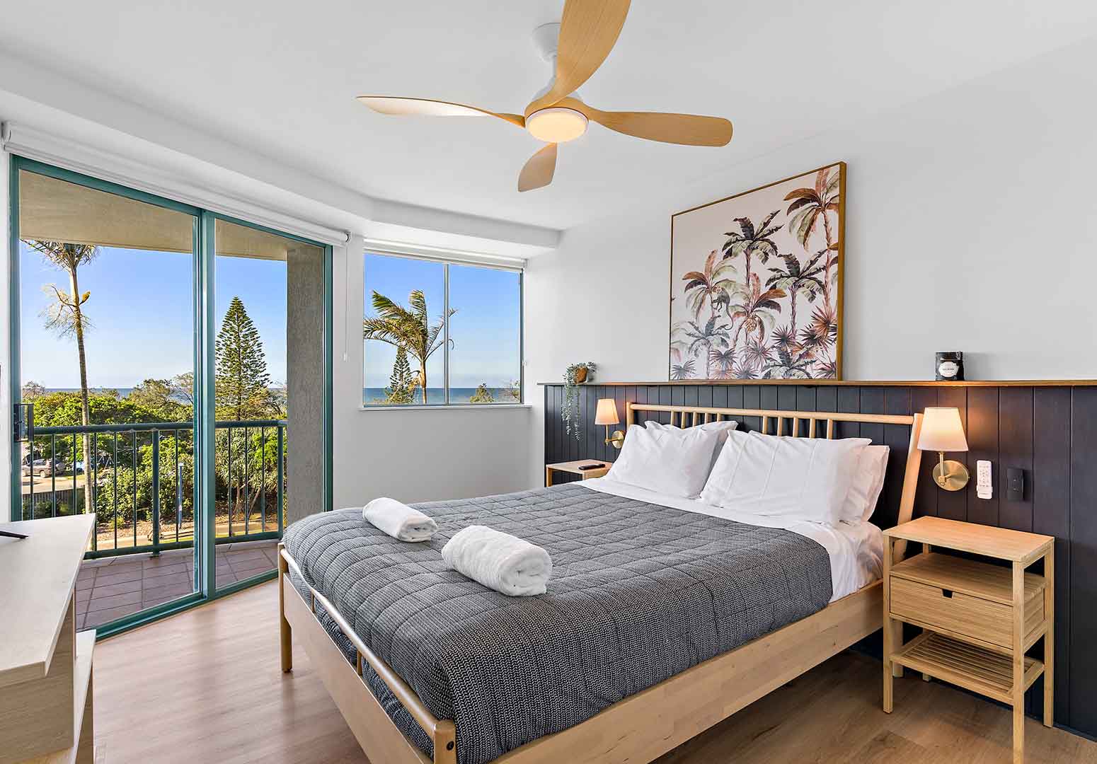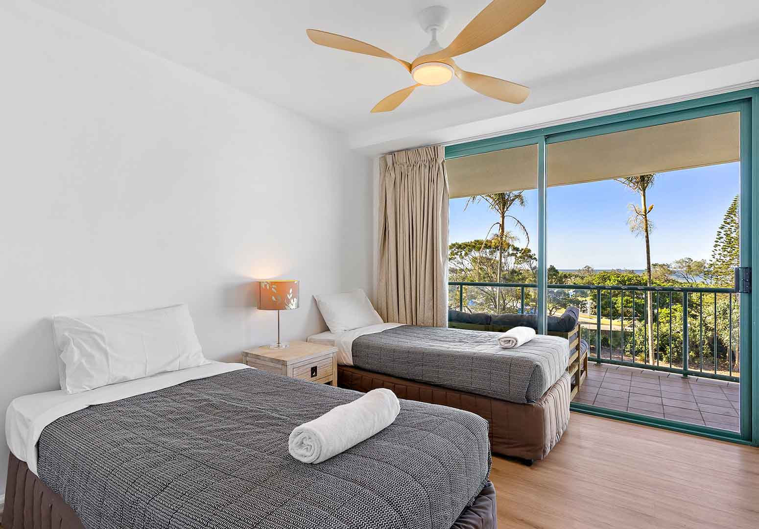 Two-bedroom holiday apartments comfortably accommodate up to four guests and feature floor-to-ceiling glass sliding doors that open onto a private, spacious beachfront balcony with water views.