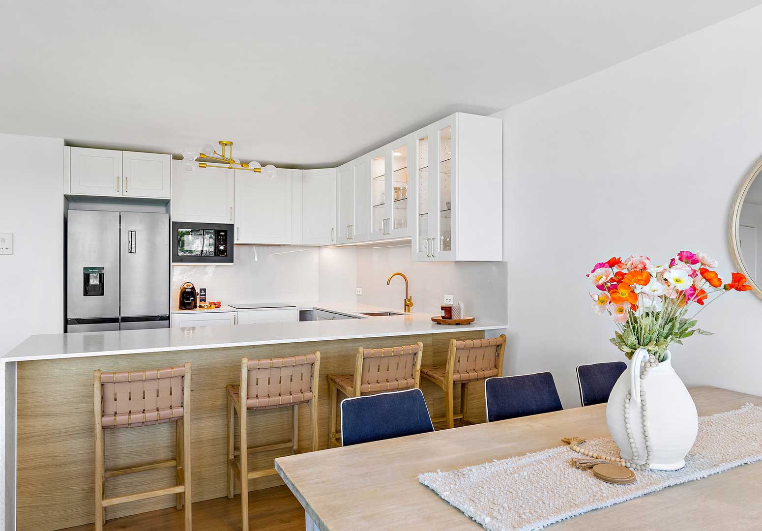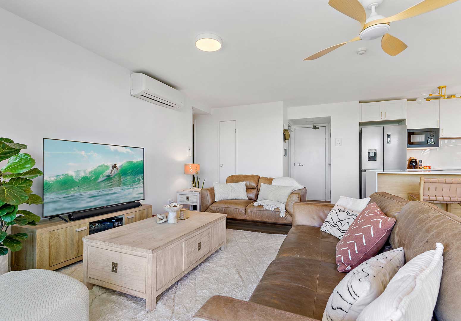 The open-plan kitchen, dining, and living area includes a leather or fabric 2- and 3-seater lounge suite, offering the comfort of home. The master bedroom includes a queen bed and ensuite, while the second bedroom is furnished with two single beds and a separate bathroom with shower/bath and toilet. Two queen beds can be requested, subject to availability and room allocation.