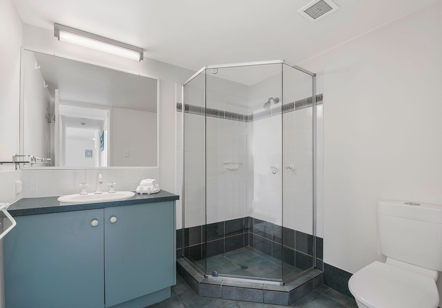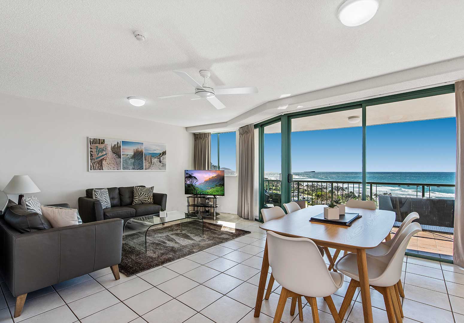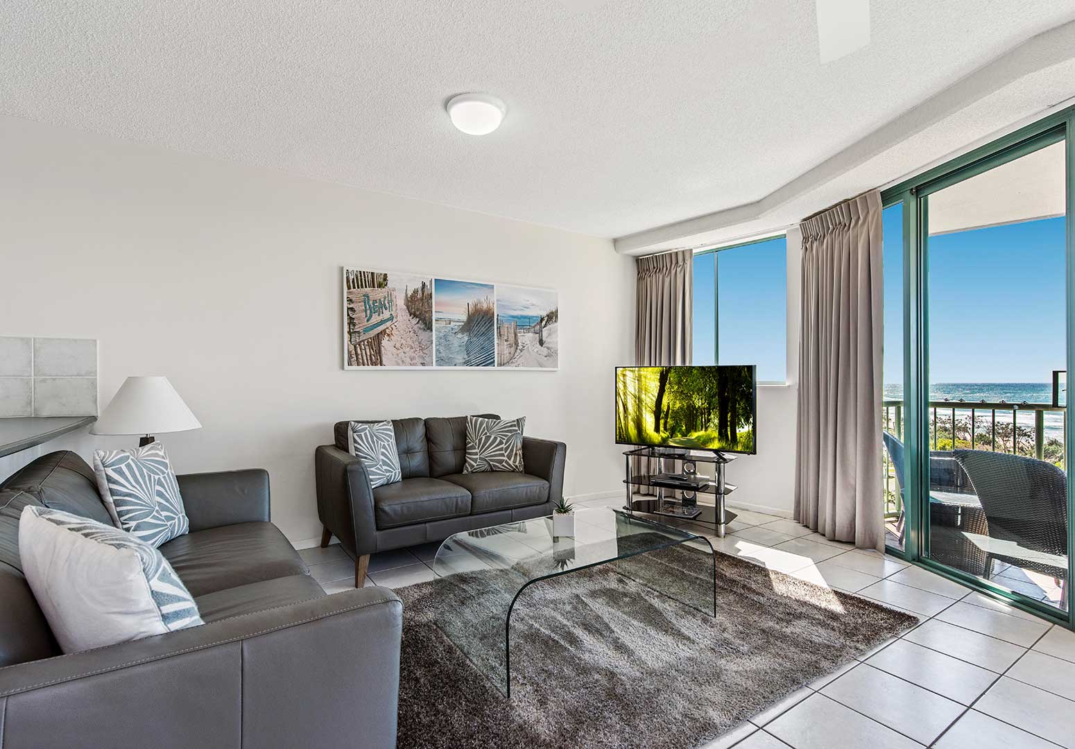 Designed for up to four guests, these apartments share the same spacious layout as other two-bedroom options, featuring floor-to-ceiling glass sliding doors that open onto a generous beachfront balcony with stunning ocean views stretching along the coast. Inside, you'll find an open-plan living and dining area, a fully self-contained kitchen, and all the comforts of home. The master bedroom includes a queen bed and ensuite, while the second bedroom features two single beds, a main bathroom with shower/bath, and a separate toilet.