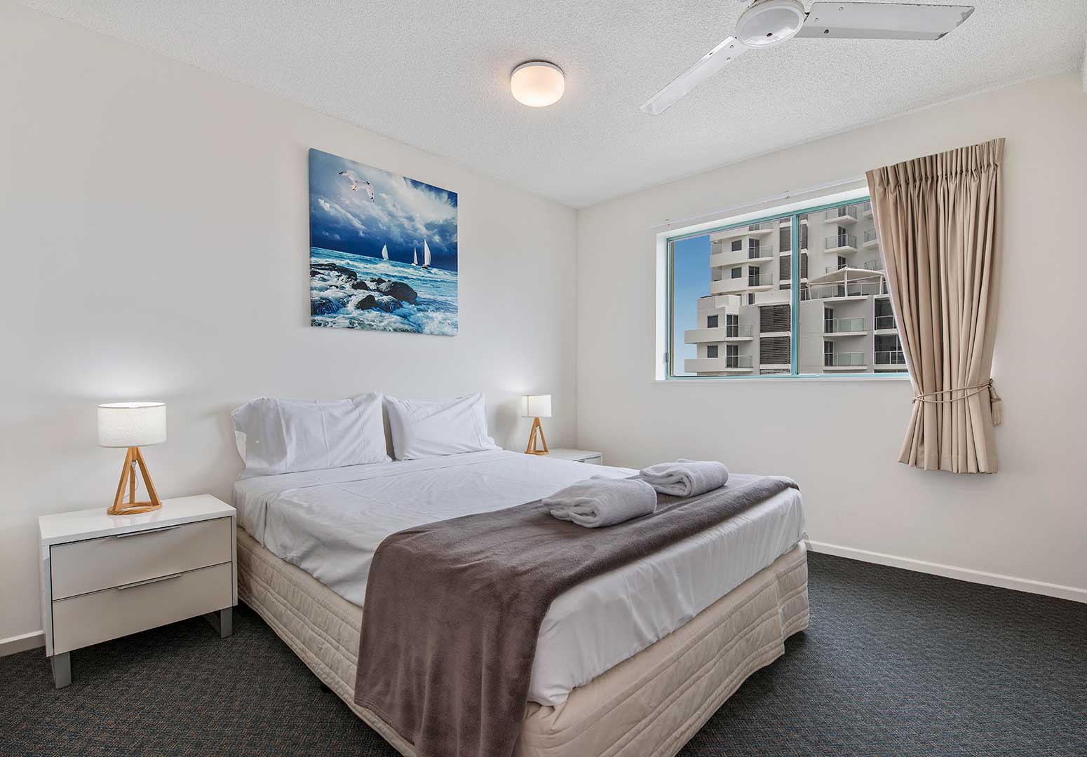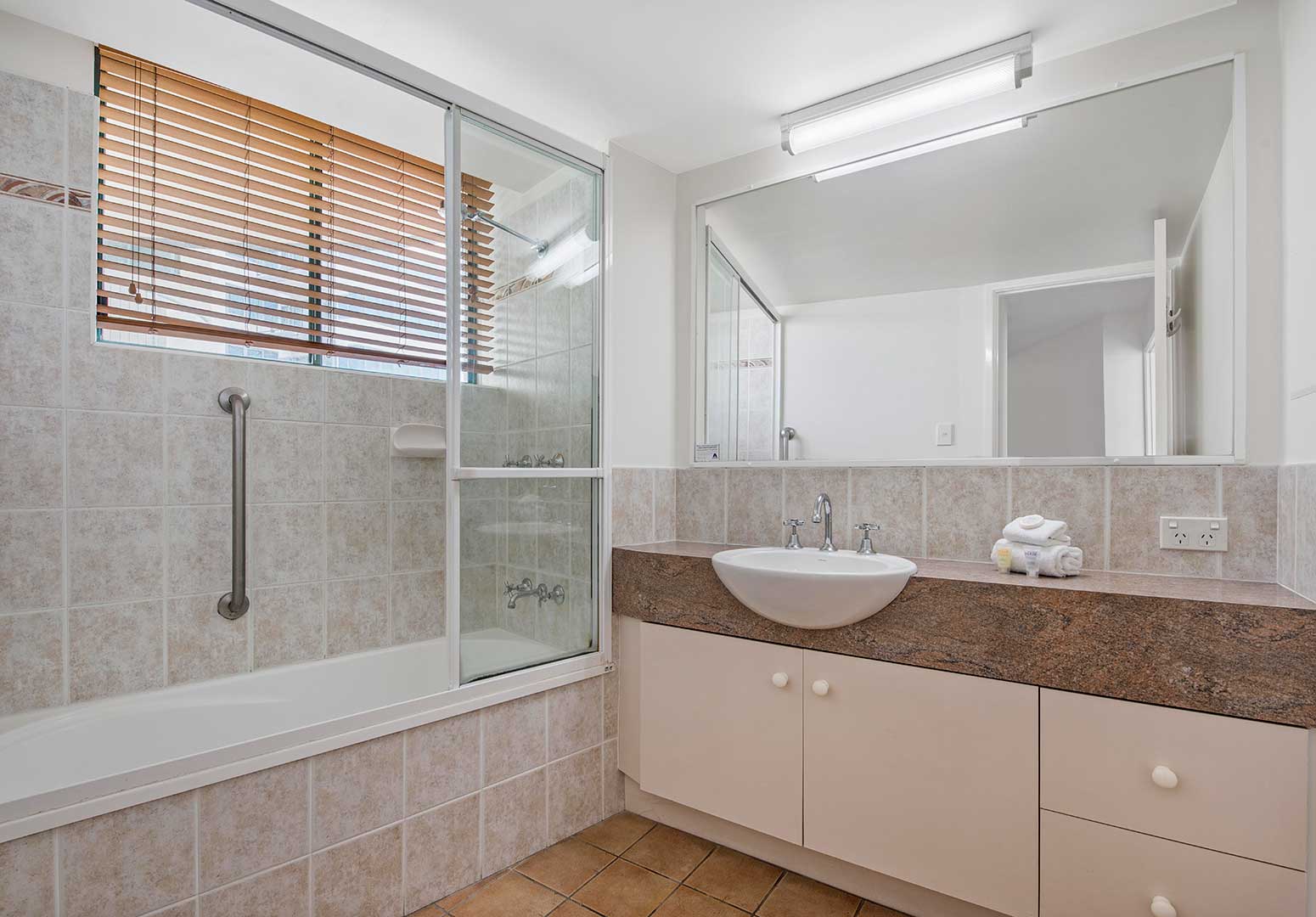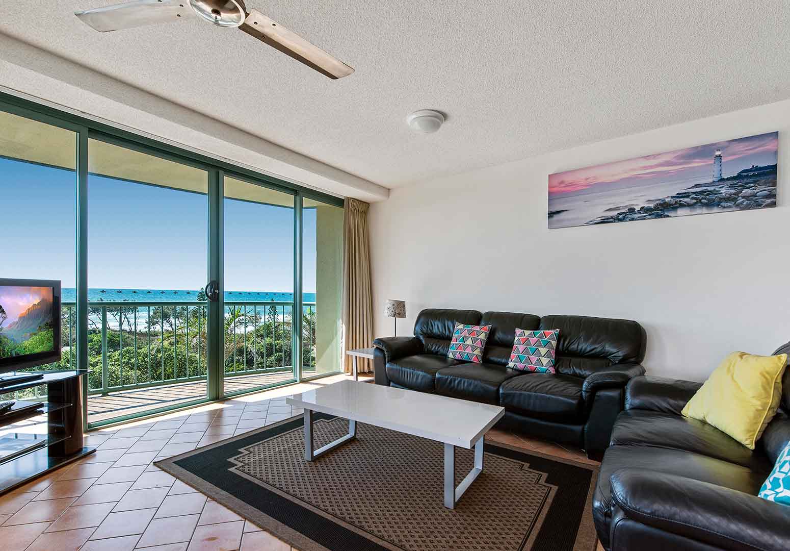 Three-bedroom holiday apartments accommodate up to six guests and feature a spacious beachfront balcony with ocean views, as well as a rear balcony overlooking the pool.