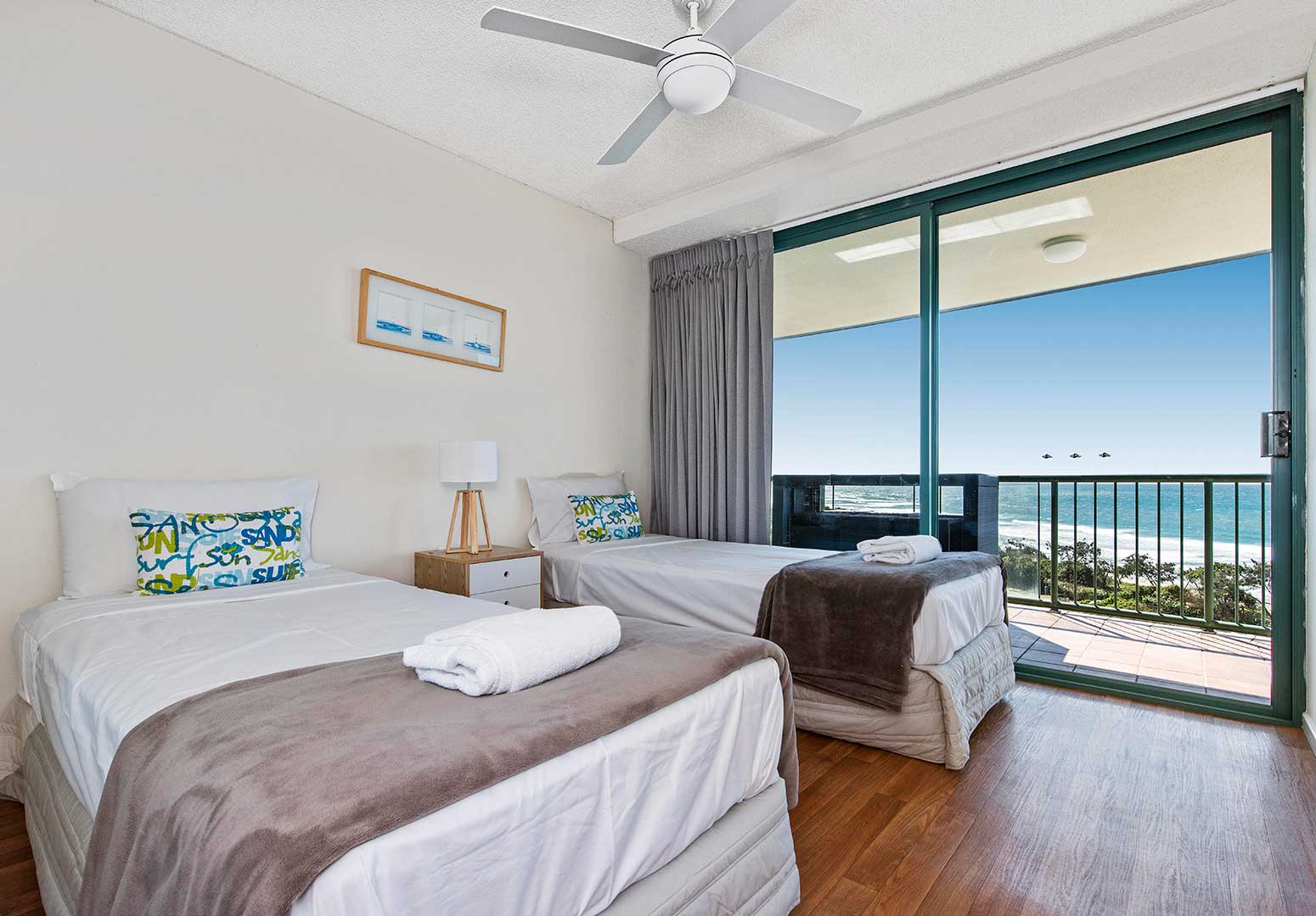 Designed for up to four guests, these apartments share the same spacious layout as other two-bedroom options, featuring floor-to-ceiling glass sliding doors that open onto a generous beachfront balcony with stunning ocean views stretching along the coast. Inside, you'll find an open-plan living and dining area, a fully self-contained kitchen, and all the comforts of home. The master bedroom includes a queen bed and ensuite, while the second bedroom features two single beds, a main bathroom with shower/bath, and a separate toilet.